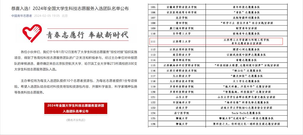 本网讯 2月5日,中国青年志愿者协会、中国科协宣传文化部公布了2024年全国大学生科技志愿服务宣讲团入选团队名单,抖阴 资源与环境工程学院青年志愿者协会宣讲团成功入选。