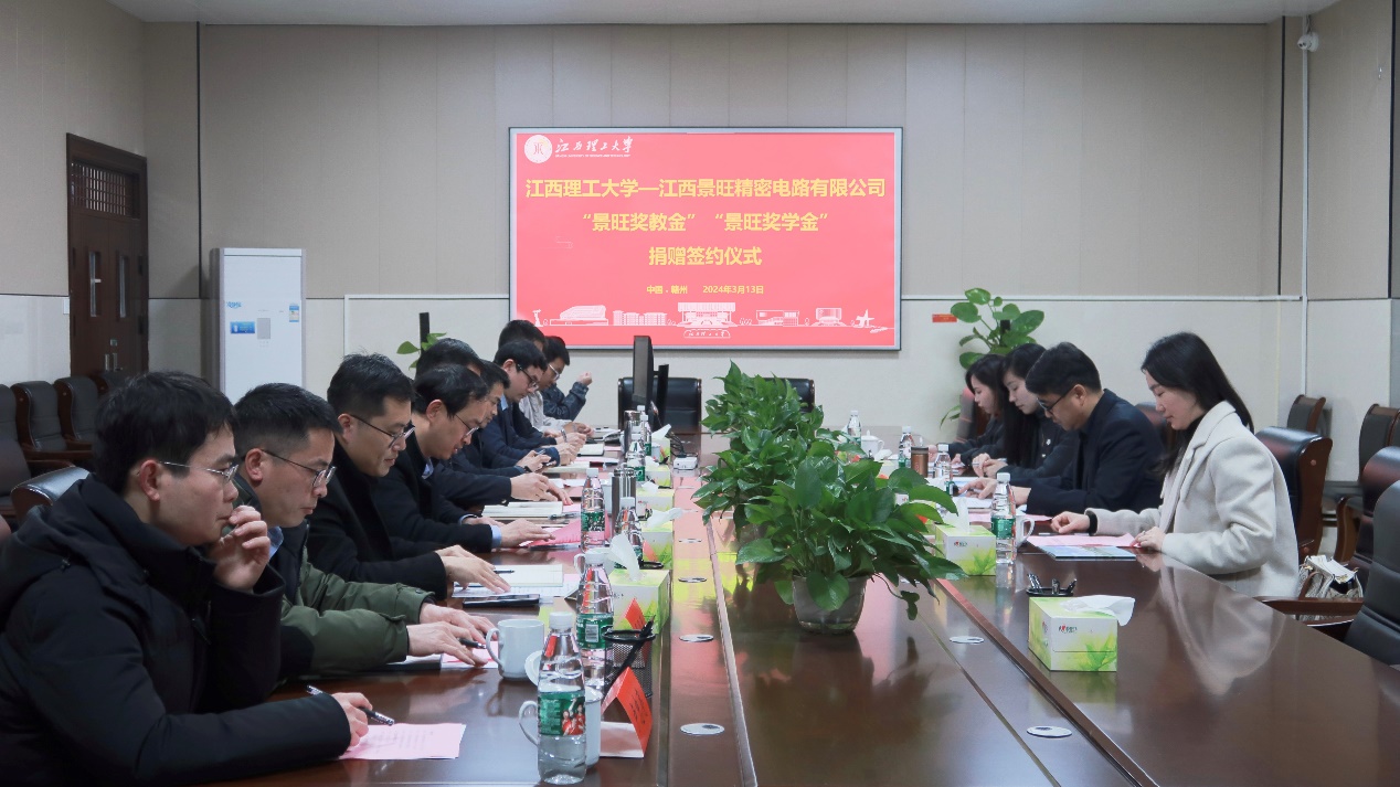 “景旺奖教金”“景旺奖学金”捐赠签约仪式在三江校区九章楼303会议室举行。江西景旺精密电路有限公司信丰公司总经理张建庭,校党委常委、副校长熊志华出席会议。党委学生工作部等相关职能部门代表,理学院、信息工程学院代表及专业教师等参加捐赠签约仪式。