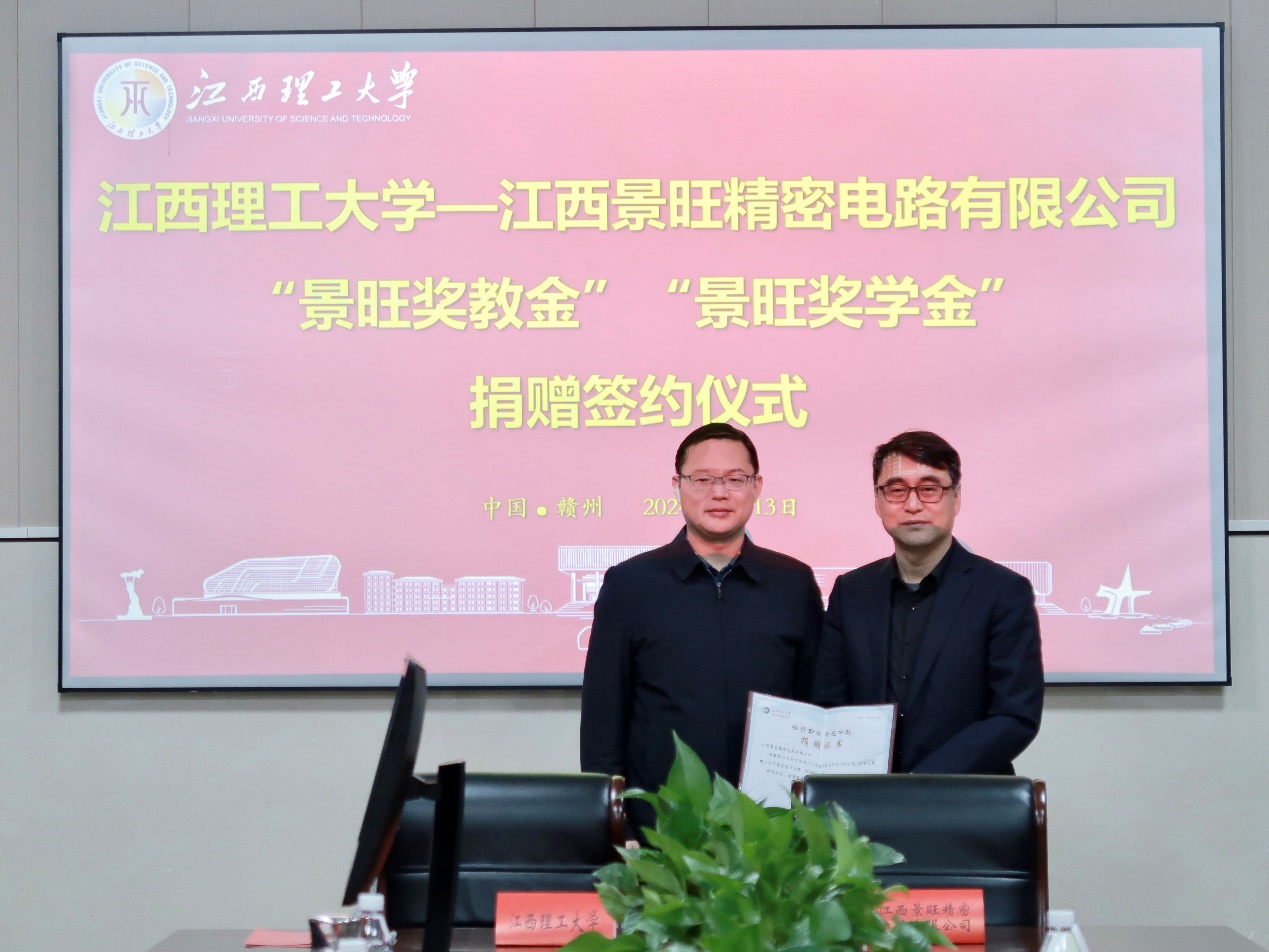 仪式上,双方签署了捐赠协议,副校长熊志华代表学校向江西景旺精密电路有限公司颁发捐赠证书。
