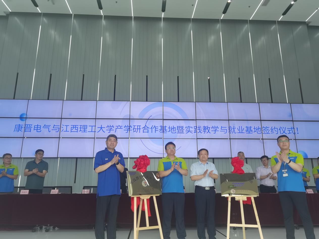 与康晋电气产学研合作基地签约仪式在赣州市康晋电气设备有限公司举行。校党委常委、副校长龚姚腾,赣州高新开发区主任谢博,康晋电气集团副总经理胡伟峰,赣州市康晋电气设备有限公司领导与员工代表,电气工程与自动化学院院长刘细平、副院长林元璋及教师代表参加本次活动。