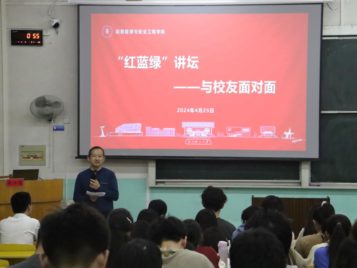 本网讯 4月25日,应急管理与安全工程学院在红旗校区主教学楼D02教室举办“红蓝绿”讲坛——与校友面对面,邀请中国稀土集团南方稀土国际贸易有限公司副总经理、安全工程专业2013届毕业生戴圣贤作题为《从校园步入社会,你准备好了吗?》的讲座。讲座由学院党委副书记李肖锋主持。应急管理与安全工程学院学生参加讲座。