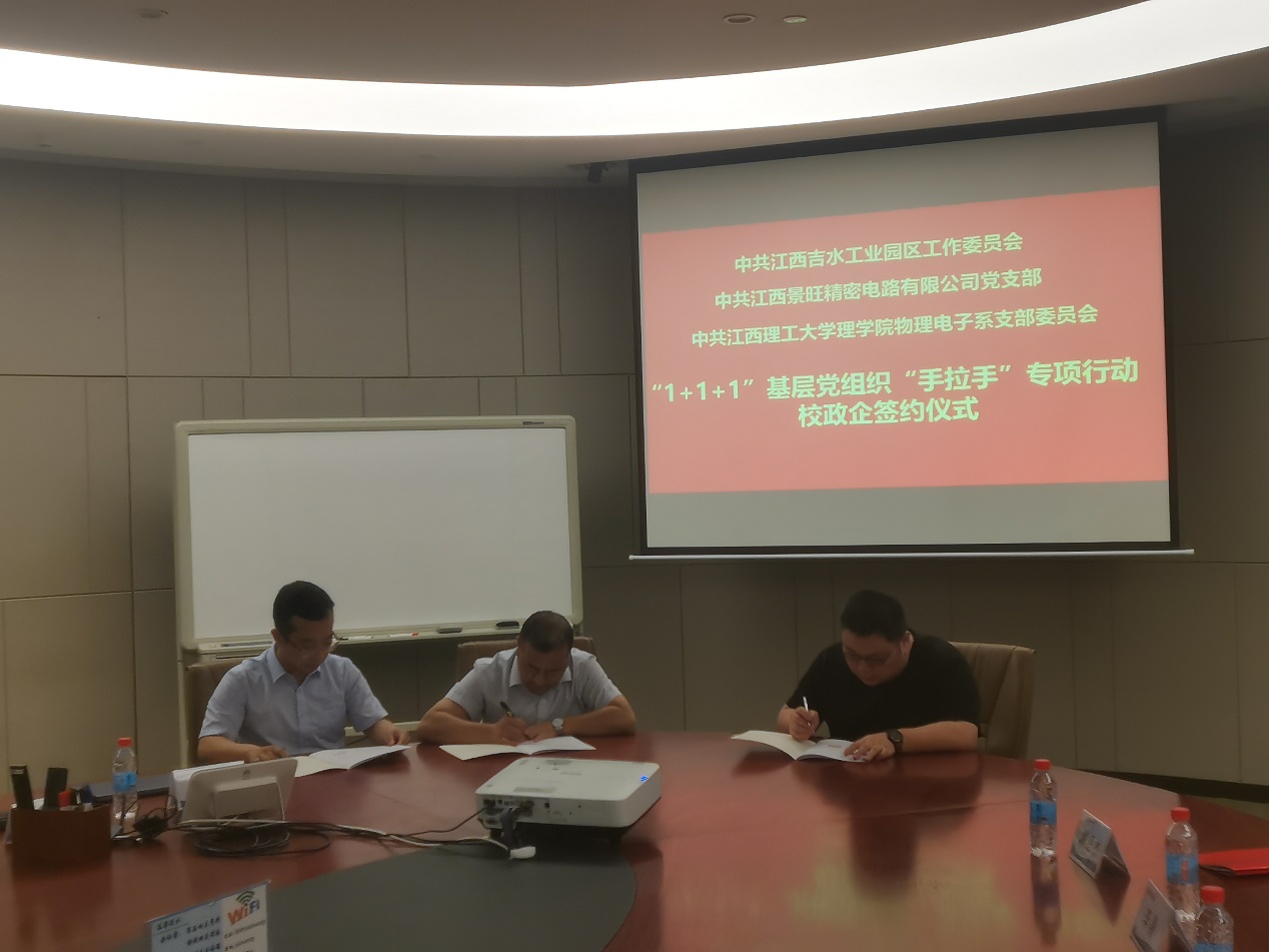 理学院物理电子系党支部联合吉水工业园区党工委、江西景旺精密电路有限公司党支部开展“1+1+1”基层党组织“手拉手”专项行动暨校政企合作专项行动。理学院党委书记周茂平、理学院院长徐中辉、理学院党委副书记钟晓辉等人参加活动。