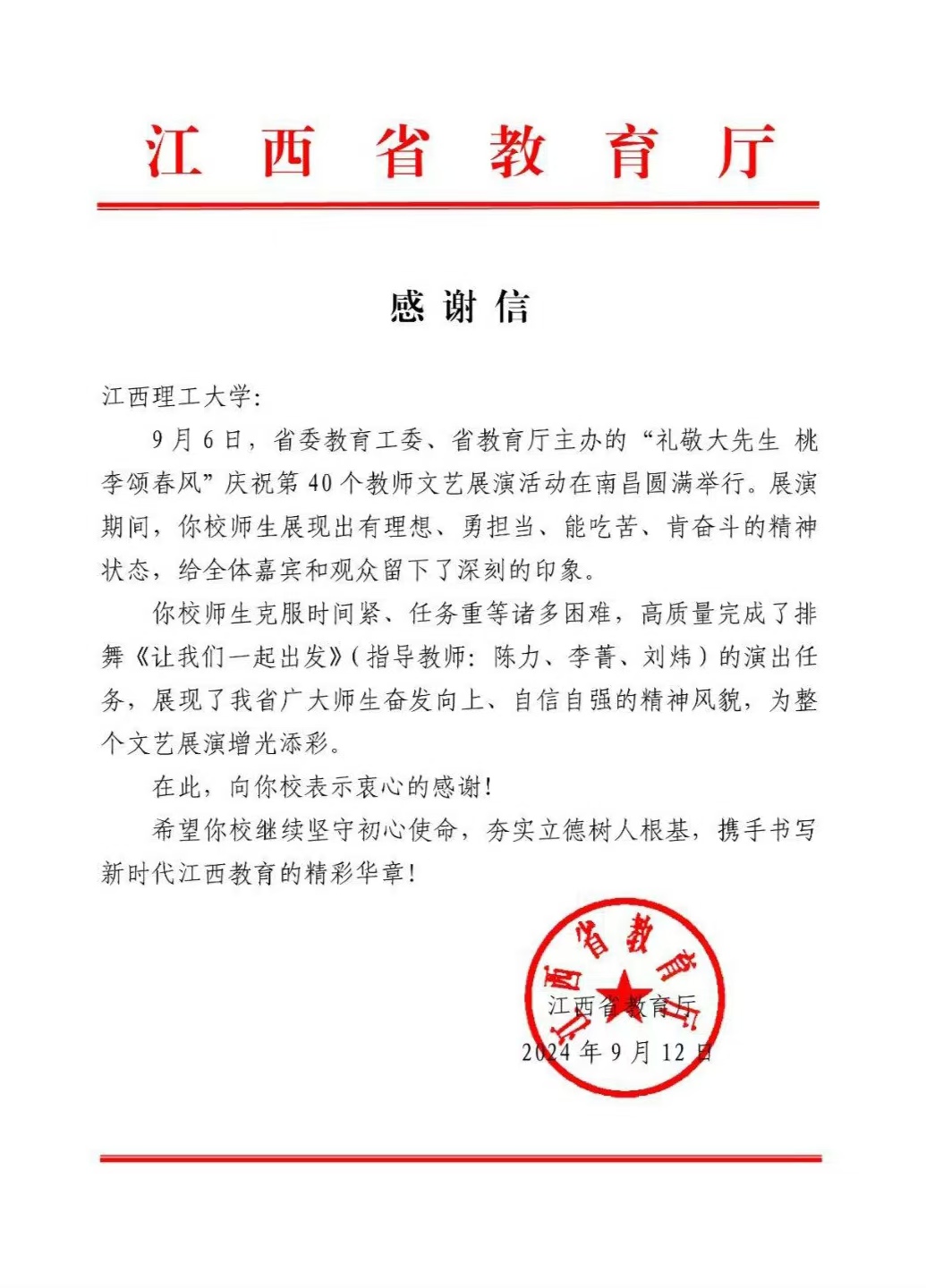 本网讯 9月12日,江西省教育厅向抖阴 啦啦操队发来感谢信,信中对学校啦啦操队以“有理想、勇担当、能吃苦、肯奋斗的精神状态”克服诸多困难,高标准完成了排舞《让我们一起出发》节目给予了高度认可,对学校啦啦操队为整个文艺展演作出的卓越贡献致以最诚挚的感谢。
