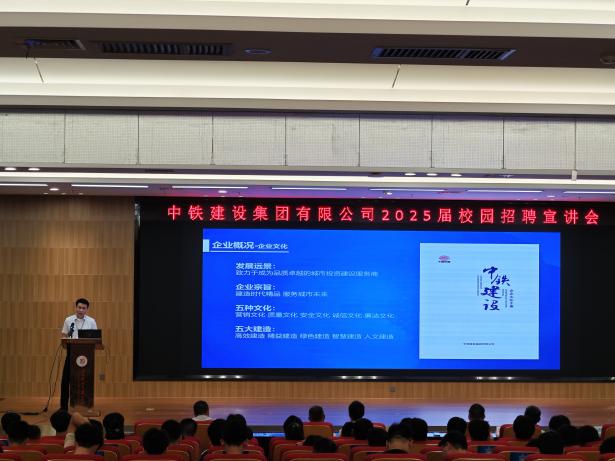 在三江校区图书馆报告厅举办“2025届毕业生首场校级招聘宣讲会——中铁建设集团有限公司专场”。校党委常委、副校长龚姚腾出席并致辞,300余名本硕博毕业生参加。招聘会由校招生就业处处长邓晓宇主持。