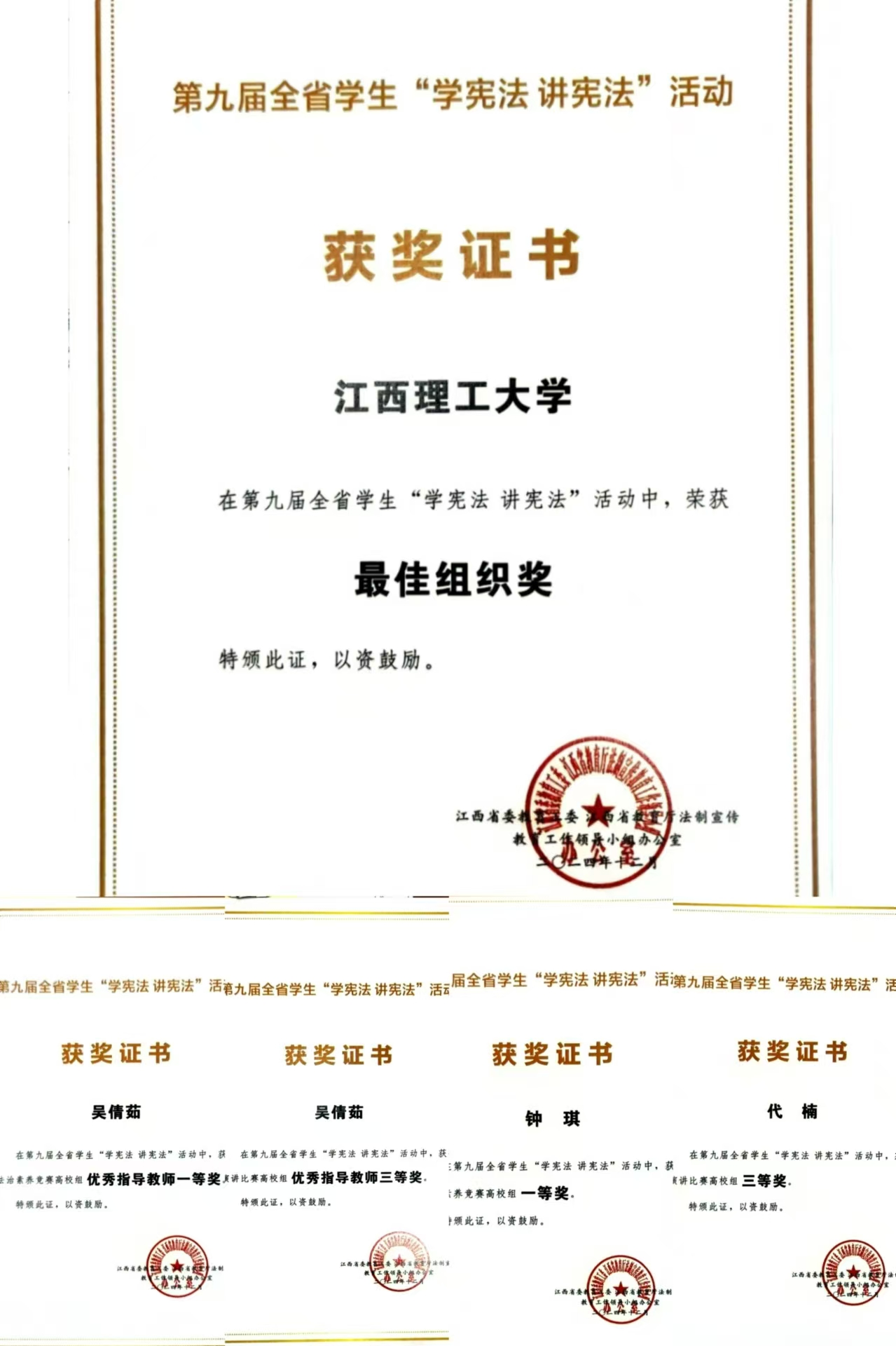 本网讯 近日,江西省委教育工委、江西省教育厅法制宣传工作领导小组办公室下发了《关于公布第九届全省学生“学宪法 讲宪法”活动获奖名单的通知》,抖阴 获评第九届全省学生“学宪法 讲宪法”活动最佳组织奖。同时,抖阴 法学院学子钟琪荣获法治素养竞赛一等奖、代楠荣获演讲比赛三等奖,法学院吴倩茹老师获优秀指导教师一等奖、三等奖各一项。