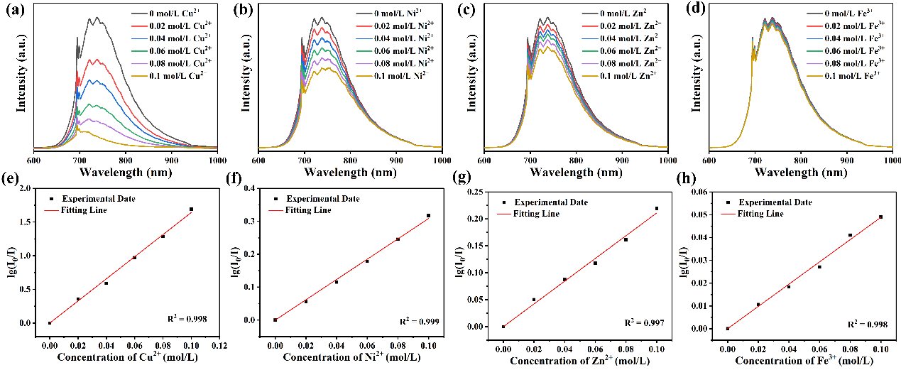 图3 (a)-(d) 使用 NIR pc-LED光源测量的CuCl2、NiCl2、ZnCl2和FeCl3水溶液在不同浓度下的透射光谱;(e)-(h) Cu2+、Ni2+、Zn2+和Fe3+浓度c与lg(I0/I)之间的关系图。