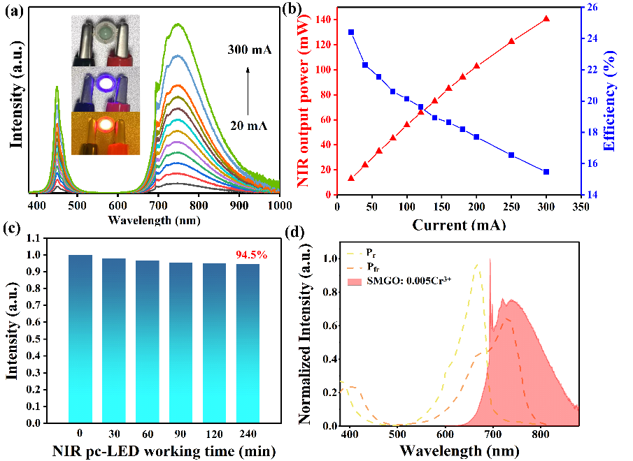 图2 (a) NIR pc-LED在不同驱动电流下的电致发光光谱,插图分别是制备好的pc-LED、点亮后的pc-LED以及透过光学滤波片后的点亮pc-LED的照片;(b) NIR pc-LED的输出功率和光电效率随驱动电流变化;(c) 是NIR pc-LED的EL强度随持续时间的变化;(d) 是SMGO: 0.005Cr3+和植物生长所需Pfr的光谱。
