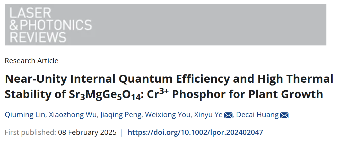 稀土学院稀土发光材料及器件研究所叶信宇教授和黄得财副研究员在稀土发光材料领域取得重要研究成果,成果以“Near-Unity Internal Quantum Efficiency and High Thermal Stability of Sr3MgGe5O14: Cr3+ Phosphor for Plant Growth”为题公开发表在光学领域权威期刊《Laser & Photonics Reviews》(一区Top,影响因子9.8)。论文第一作者为2022级博士研究生林秋明,通讯作者为叶信宇教授和黄得财副研究员。
