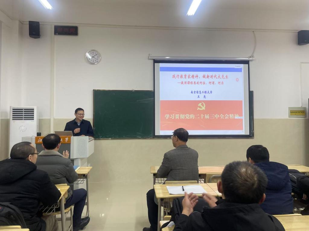 师生作题为“弘扬教育家精神,做新时代大先生——数理课程思政何位、何谓、何为”的课程思政专题报告。校党委常委、副校长熊志华,理学院全体教师,机电工程学院、电气工程与自动化学院、信息工程学院部分教师与研究生代表共同聆听。报告由熊志华主持。