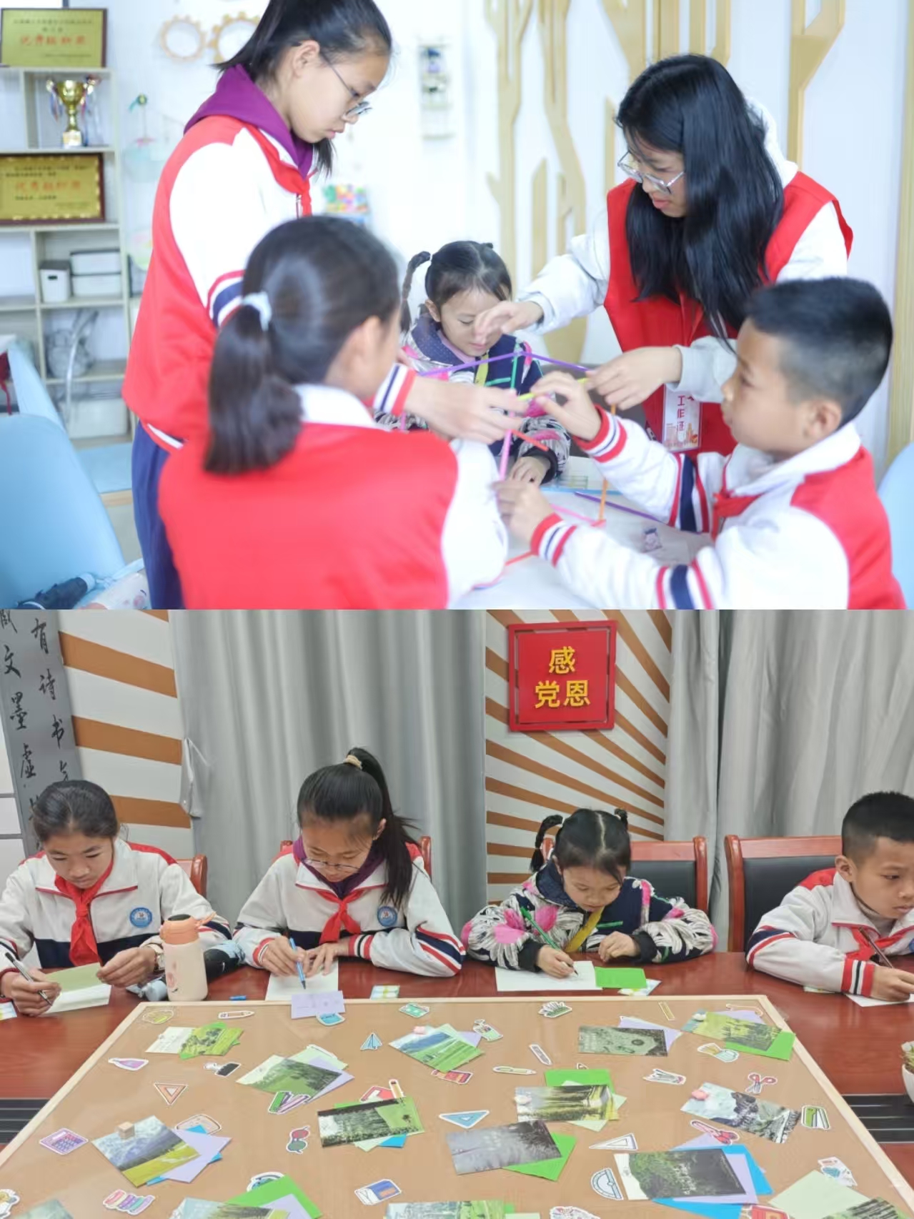 志愿者带领小学生们参观党团活动室、思政工作室等6大功能区,通过“讲解+体验+实践”模式,让“真理的味道”浸润童心。在“理筑红坊”党团活动室,小学生们参观“党员先锋岗”,听大哥哥大姐姐讲述他们在校园里为师生服务的故事。活动室还特别设计了“红色24点”游戏,将“1921”“2025”等数字融入题目,让数学运算成为党史学习的新载体。走进劳动教育基地“明德理苑”,六年级学生李秋艳专注地剪着“π”字窗花,用数字串珠编织手链,将抽象的数理概念化作指尖的艺术。