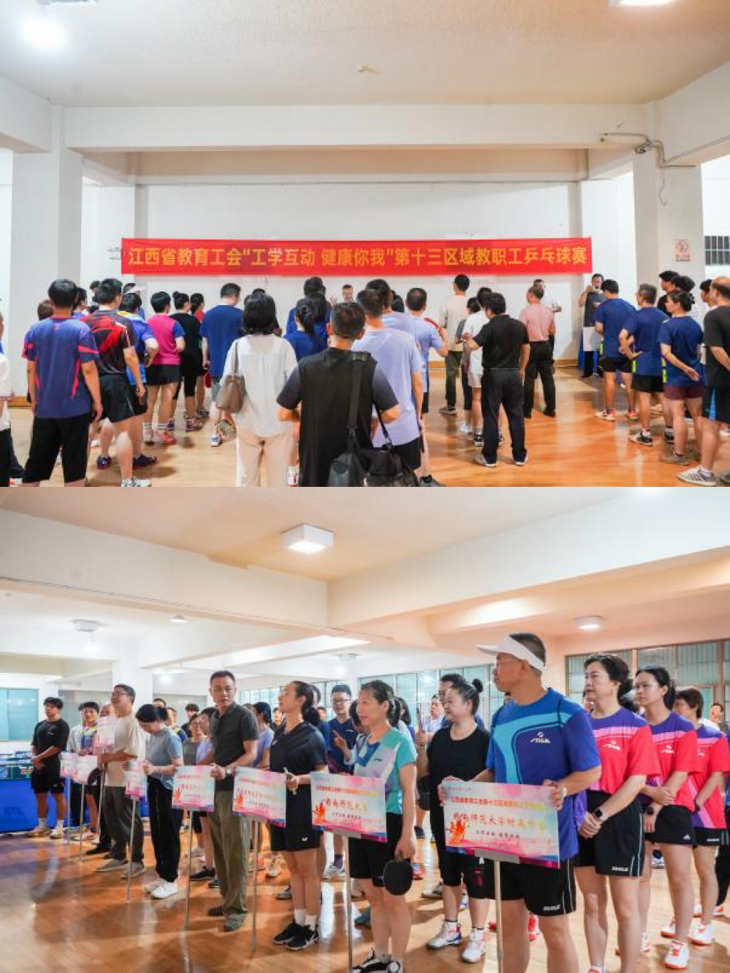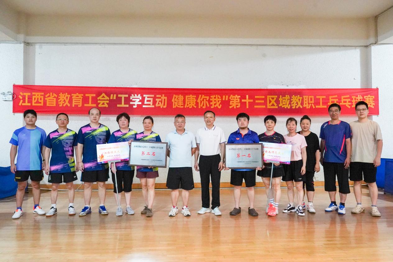 本网讯 6月15日,江西省教育工会“工学互动 健康你我”第十三区域教职工乒乓球赛在抖阴 红旗校区体育馆圆满落幕。本次比赛由江西省教育工会主办、抖阴 工会承办,吸引了来自区域内抖阴 、赣南师范大学、赣南师范大学附属中学、赣南医科大学及其第一、第二、第三附属医院、赣州市教育工会(下属赣州中学、赣州市第三中学)等多家单位的教职工踊跃参与。