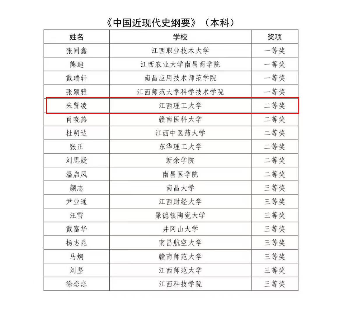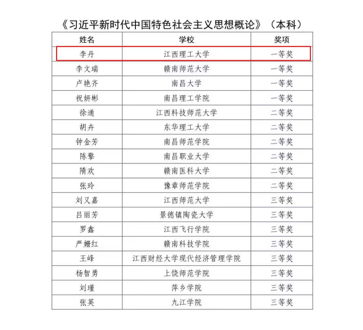思政课教师李丹荣获《习近平新时代中国特色社会主义思想概论》本科组一等奖、朱贤凌荣获《中国近现代史纲要》本科组二等奖、周光玲荣获《毛泽东思想和中国特色社会主义理论体系概论》本科组三等奖、熊玥荣获《思想道德与法治》本科组三等奖。