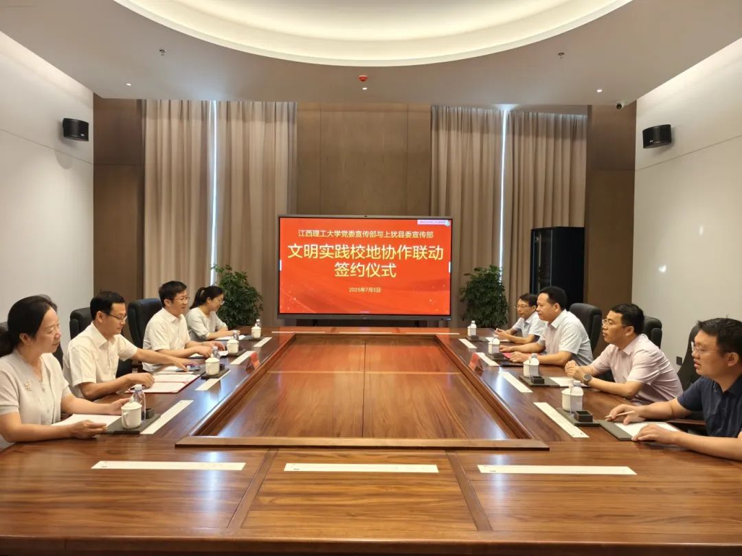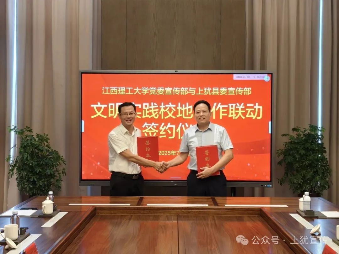 本网讯 为促进高校和地方文明实践双向赋能,7月5日,抖阴 党委宣传部与上犹县委宣传部举行文明实践校地协作联动座谈会暨签约仪式。校党委副书记徐志峰,校党委常委、宣传部部长盛晓明,上犹县委常委、宣传部部长冯定春及相关部门负责同志参会。