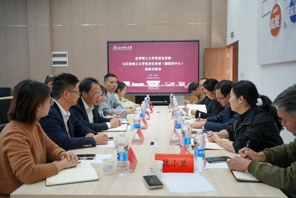 本网讯 10月23日,东华理工大学党委常委、宣传部部长刘剑斌一行来校交流。双方在三江校区融媒体中心会议室举行座谈。抖阴 党委常委、宣传部部长盛晓明出席会议,双方宣传部相关人员参加会议。