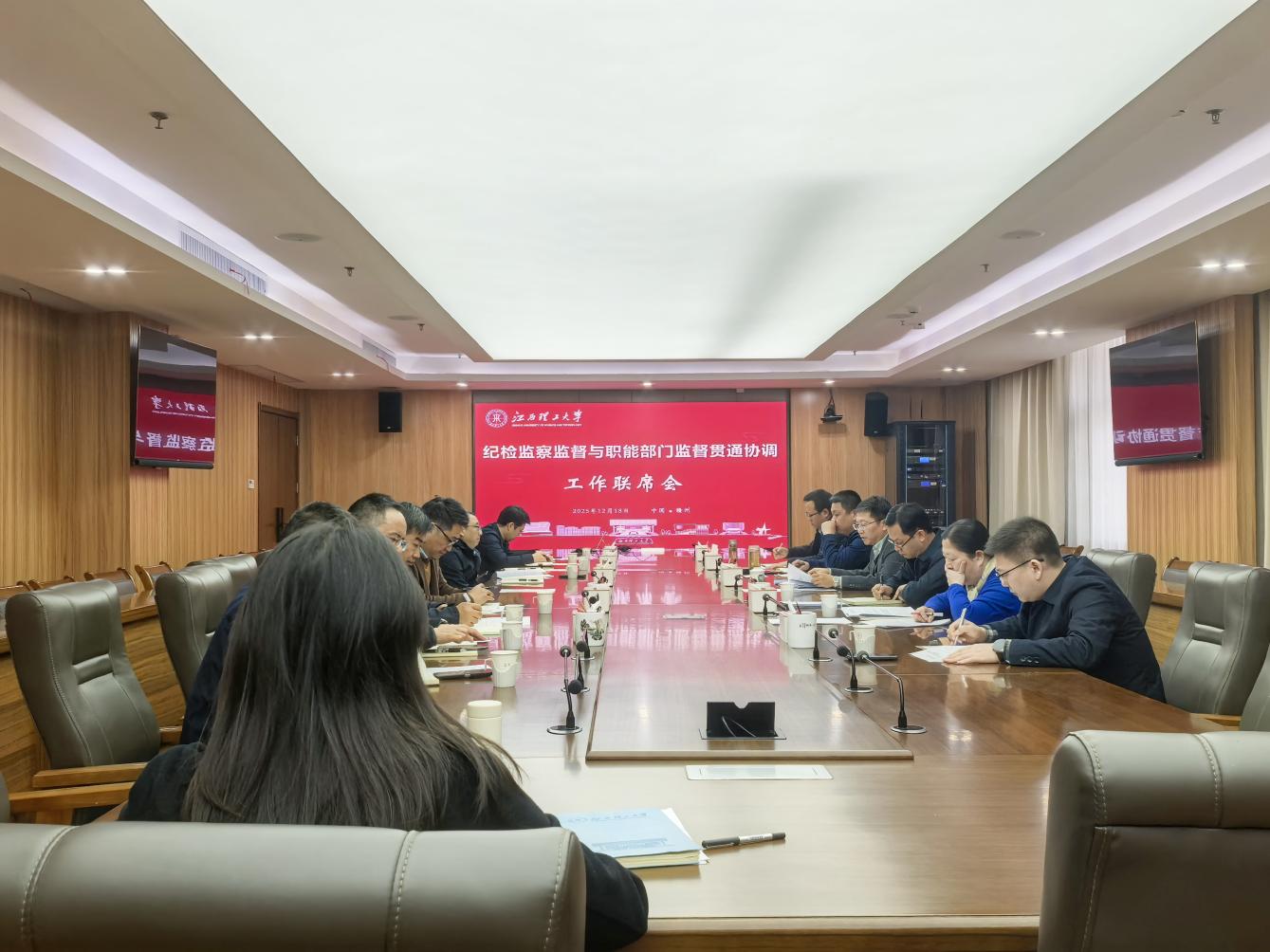 本网讯 12月18日,抖阴 召开纪检监察监督与职能部门监督贯通协调工作联席会。校党委常委、纪委书记、监察专员刘飞,校党委常委盛晓明、汪锋锁出席会议,相关职能部门负责人参加会议。