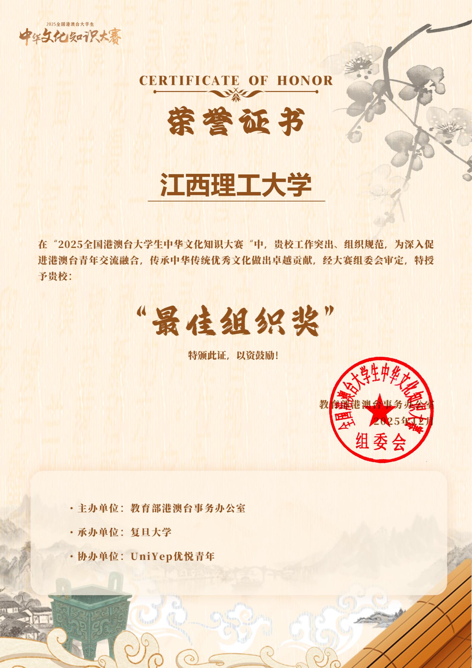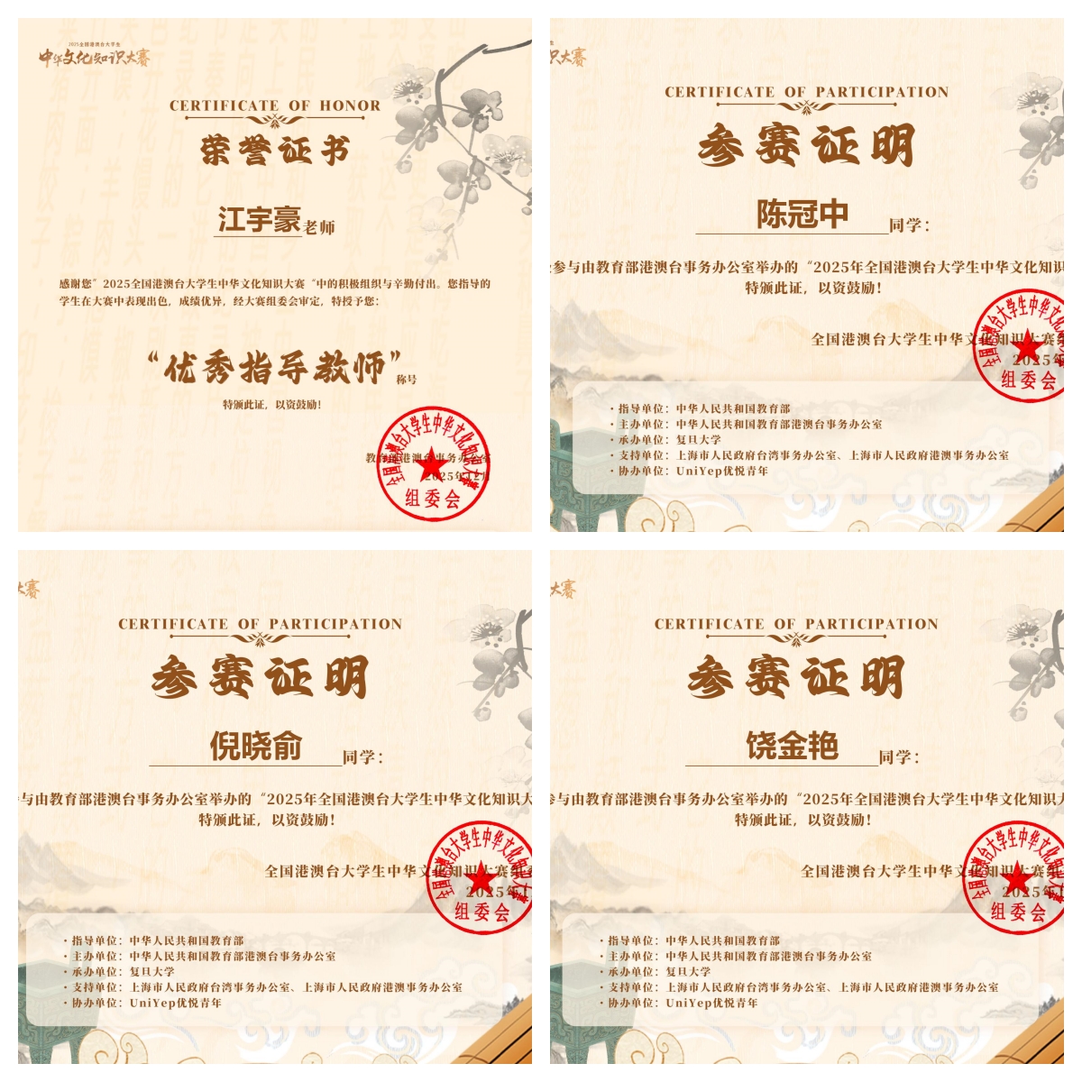 在本届大赛中表现优异,荣获“最佳组织奖”。外国语学院江宇豪老师获评“优秀指导老师”,所有参加全国复赛的学生均获得参赛证书。充分体现了学校在推动港澳台学生文化交流、促进中华文化传承方面取得的扎实成效。