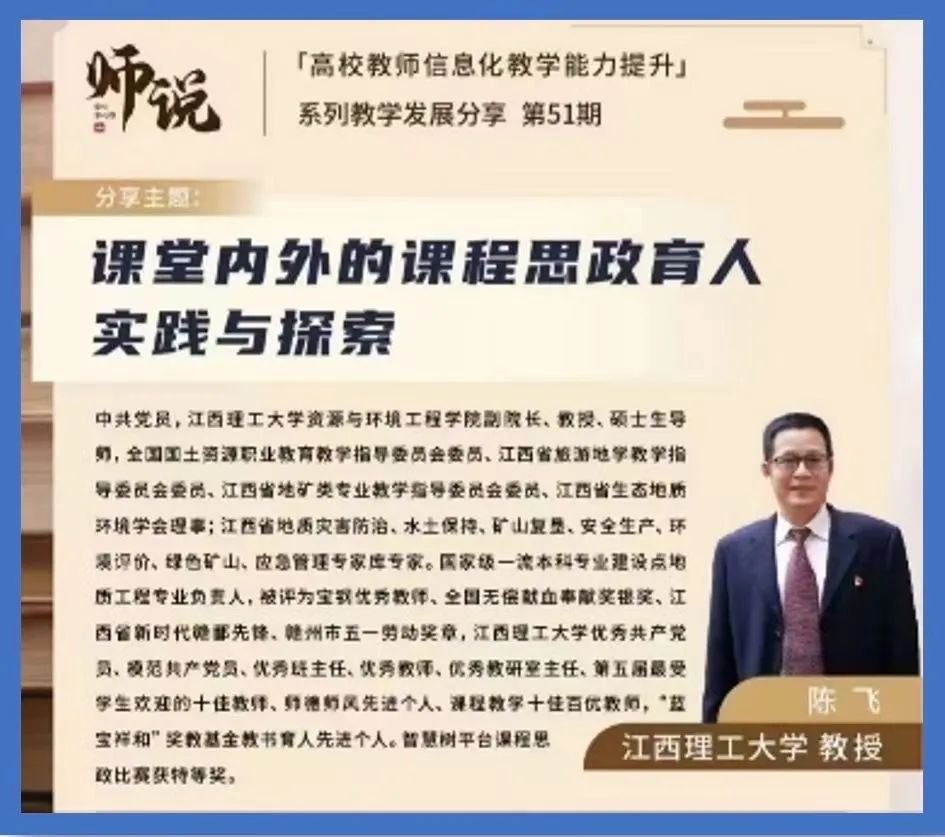 学科带头人邱廷省教授先后应邀在中央教育电视台介绍矿物加工工程专业、在江西教育电视台分享地矿专业课程思政及全员育人经验、在教育部矿业教学指导委员会上做“抖阴