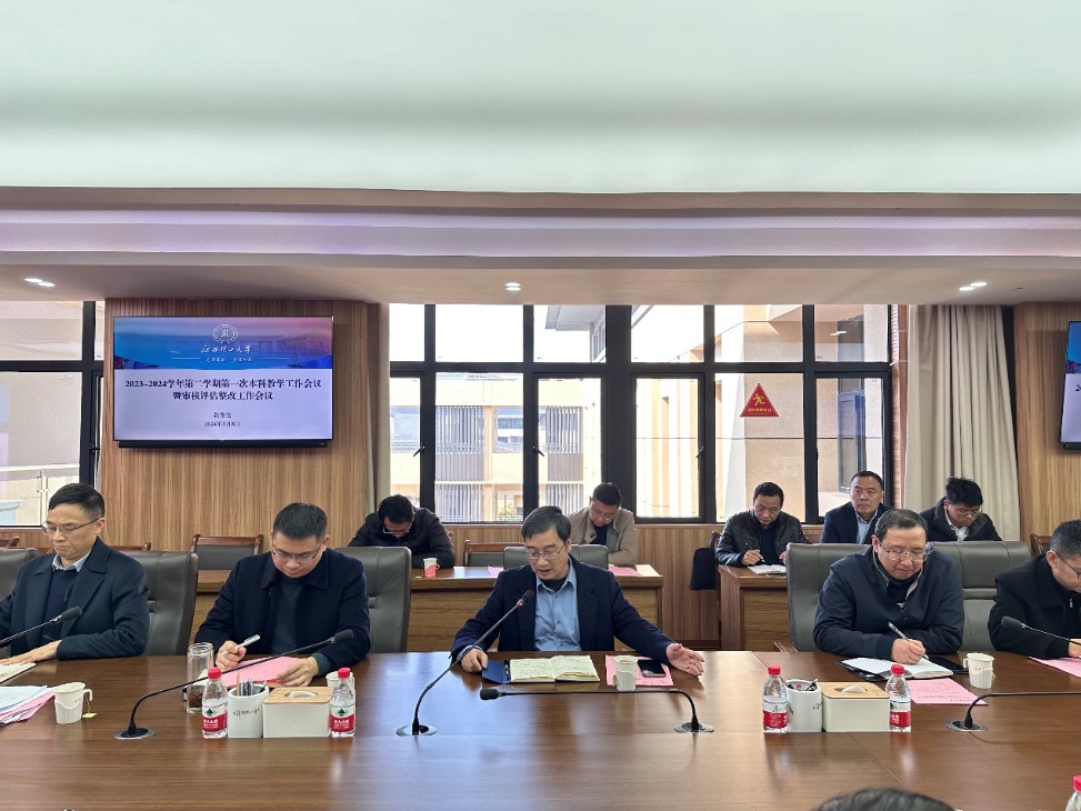 在三江校区濂溪楼2号会议室召开了2023-2024学年第二学期第一次本科教学工作会议暨审核评估整改工作会议。校党委常委、副校长黄志繁出席会议,相关职能部门负责人、各学院分管教学工作副院长及教务处全体人员参加会议。会议由校教务处处长潘春荣主持。