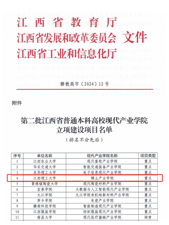 本网讯 近日,省教育厅、省发展和改革委员会、省工业和信息化厅联合下发《关于公布第二批江西省普通本科高校现代产业学院立项建设项目名单的通知》,抖阴 申报的“稀土产业学院”成功获批第二批普通本科高校现代产业学院立项建设重点项目。
