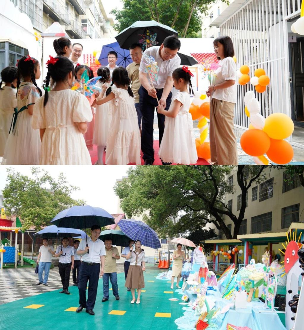 幼儿园里欢歌笑语,处处展示着孩子们的童真创意,洋溢着浓浓的节日气氛。杨斌一行观摩了红色文化展板、“遇见童心、邂逅童画”主题画展、游戏馆(体育游戏馆、益智游戏馆、手工游戏馆)等。在现场,小朋友们送上亲手制作的风车作为礼物,并兴高采烈地玩着游戏,从“贪吃蛇大作战”到“球球回家”,再到手工DIY,童趣荡漾,快乐飞扬。