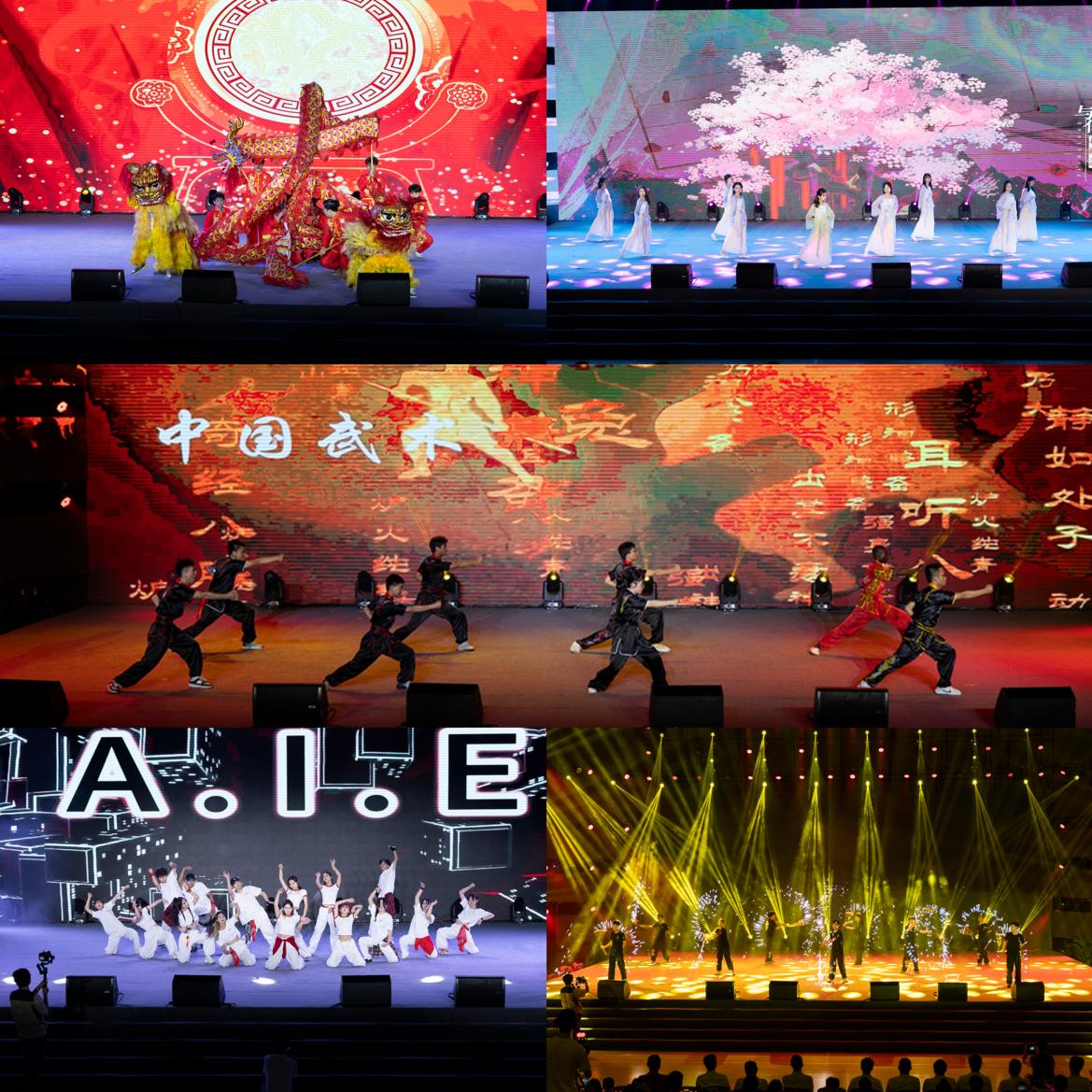 《社彩年华》舞龙舞狮表演气势磅礴,武术表演铿锵有力,古风服饰美轮美奂,街舞表演英姿飒爽,展现了抖阴