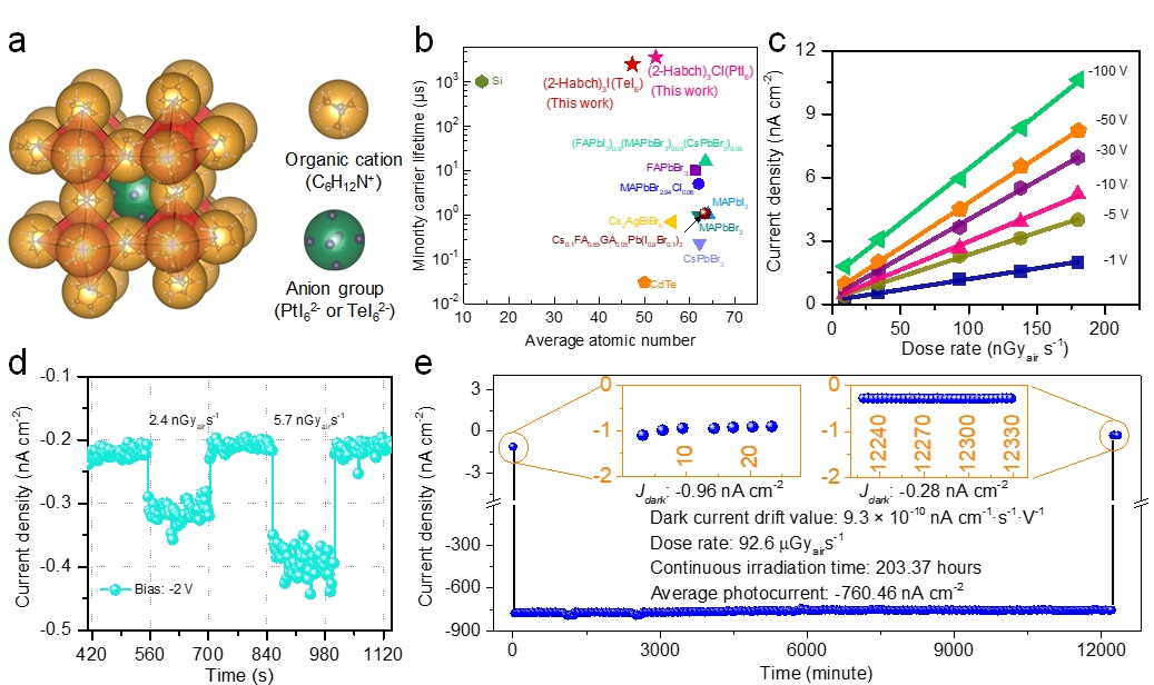 图1 (a)反钙钛矿结构示意图, (b)载流子寿命及原子序数对比图, (c)探测器在不同剂量与偏压下光电流响应拟合曲线, (d)弱光下的响应特性, (e)探测器稳定性测试结果。