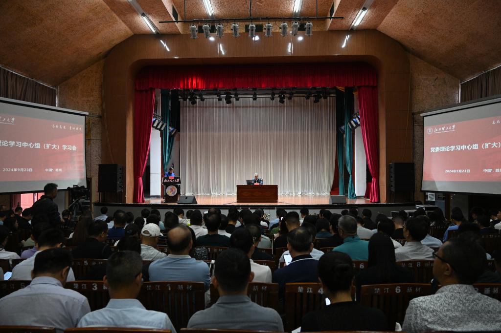 党委理论学习中心组(扩大)学习会在红旗校区大礼堂召开。武汉大学原党委常委、副校长周叶中教授受邀出席大会并做专题培训。全体在家校领导、中心组成员和二级党委书记参加会议,省委教育工委理论学习交叉指导组成员、赣南科技学院党委宣传部副部长邱俊峰列席。会议由校党委常委、副校长黄志繁主持。