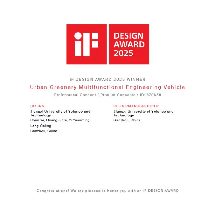 建筑与设计学院产品设计系与广州杉迪汽车技术服务有限公司共建的产教融合基地再结硕果。由黄金发教授、易元明老师、郎尹羚老师等产品设计系教师团队指导,陈烨、叶银豪等学生与校企合作完成的《城市绿化养护修剪一体工程车设计》作品,成功斩获2025年iF DESIGN AWARD WINNER大奖。这一荣誉不仅是对抖阴
