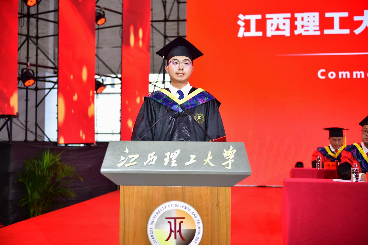 毕业本科生代表,第十五届中国大学生铸造工艺设计大赛国赛一等奖、江西省大学生创新大赛高教主赛道金奖、国家奖学金、宝钢优秀学生奖获得者,材料科学与工程学院金材213班吴若琛同学分享了满载收获与感动的四年大学时光,他表示,作为新时代的青年学子,将会继续努力拼搏、砥砺前行,做拥有智慧富有激情的人,做怀揣梦想脚踏实地的人,做德才兼备敢挑重担的人!