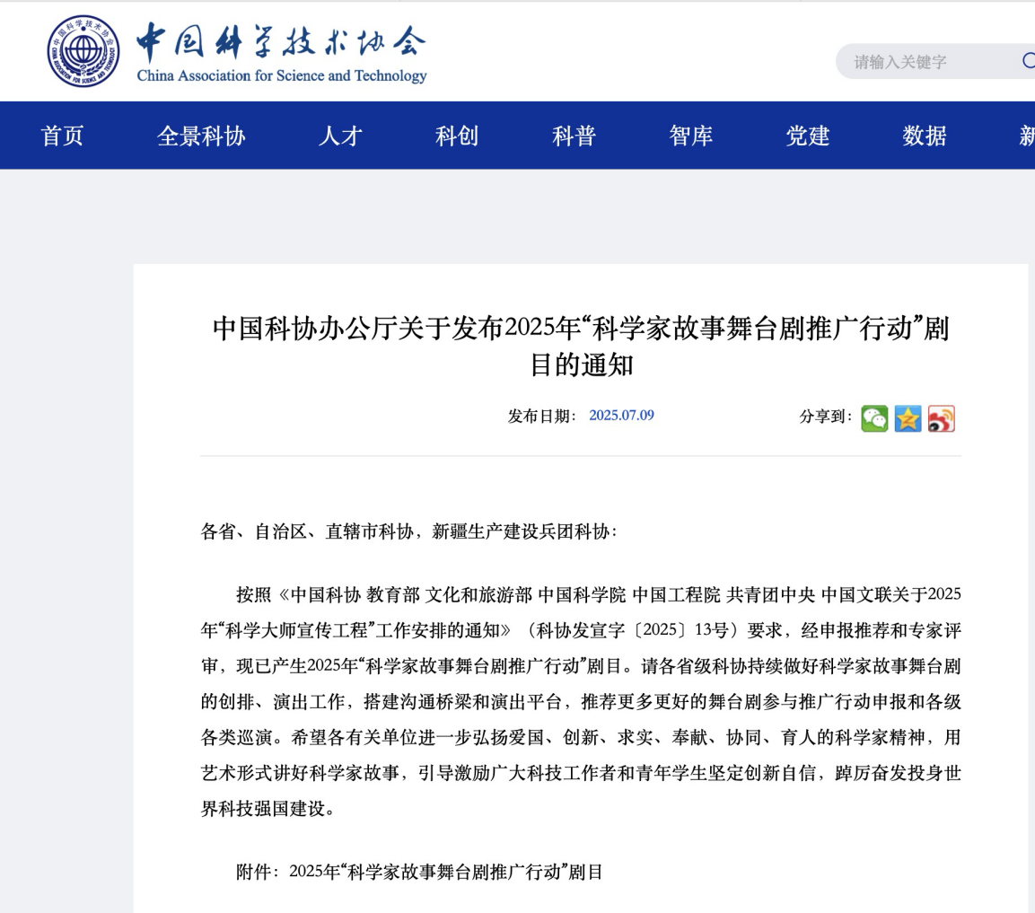 本网讯 近日,中国科协办公厅发布2025年“科学家故事舞台剧推广行动”剧目名单,由抖阴