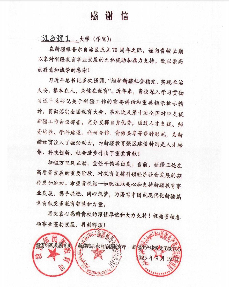 本网讯 在新疆维吾尔自治区成立70周年之际,教育部民族教育司、新疆维吾尔自治区教育厅、新疆生产建设兵团教育局三家单位联合向学校发来感谢信,感谢抖阴