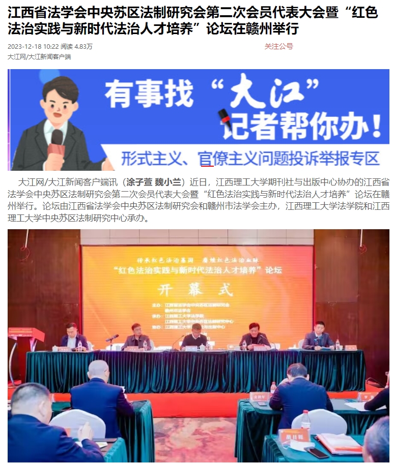 期刊社与出版中心协办的江西省法学会中央苏区法制研究会第二次会员代表大会暨“红色法治实践与新时代法治人才培养”论坛在赣州举行。论坛由江西省法学会中央苏区法制研究会和赣州市法学会主办,抖阴