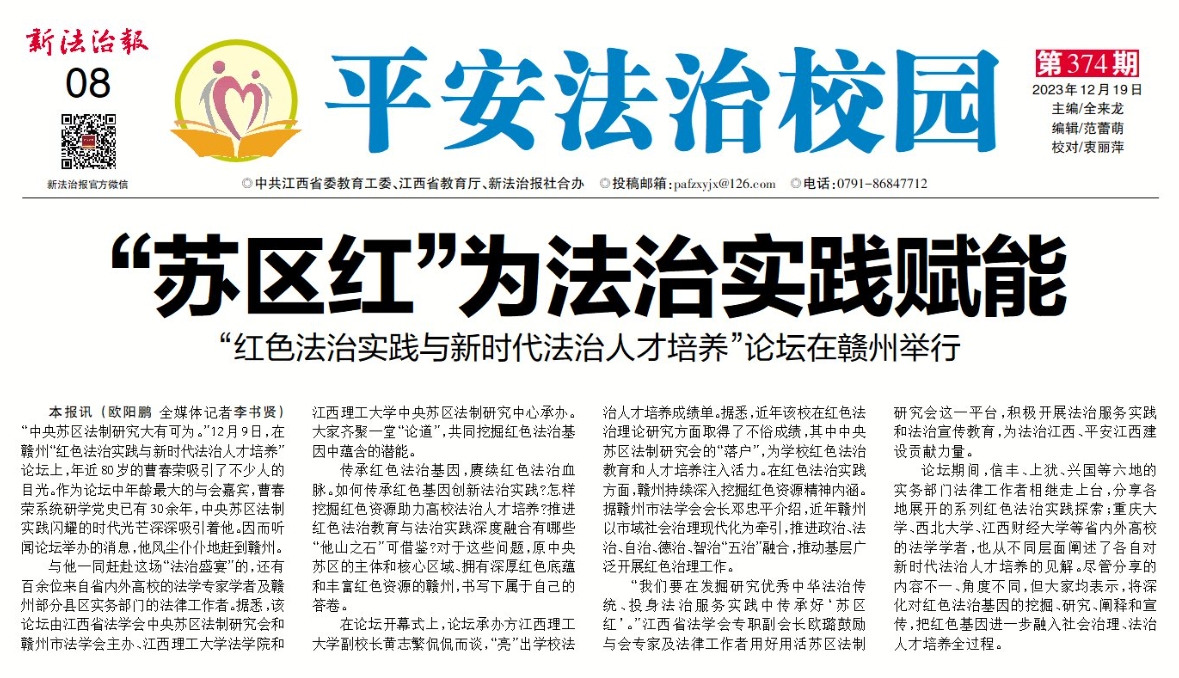 副校长黄志繁侃侃而谈,“亮”出学校法治人才培养成绩单。据悉,近年该校在红色法治理论研究方面取得了不俗成绩,其中中央苏区法制研究会的“落户”,为学校红色法治教育和人才培养注入活力。在红色法治实践方面,赣州持续深入挖掘红色资源精神内涵。据赣州市法学会会长邓忠平介绍,近年赣州以市域社会治理现代化为牵引,推进政治、法治、自治、德治、智治“五治”融合,推动基层广泛开展红色治理工作。
