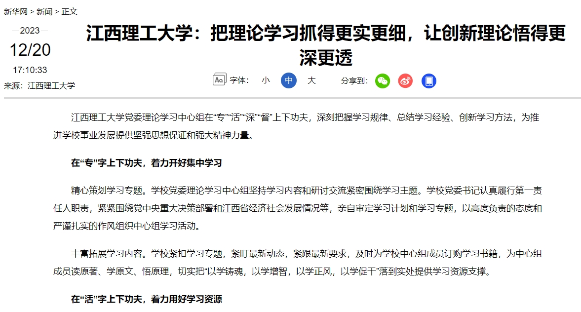 精心策划学习专题。学校党委理论学习中心组坚持学习内容和研讨交流紧密围绕学习主题。学校党委书记认真履行第一责任人职责,紧紧围绕党中央重大决策部署和江西省经济社会发展情况等,亲自审定学习计划和学习专题,以高度负责的态度和严谨扎实的作风组织中心组学习活动。