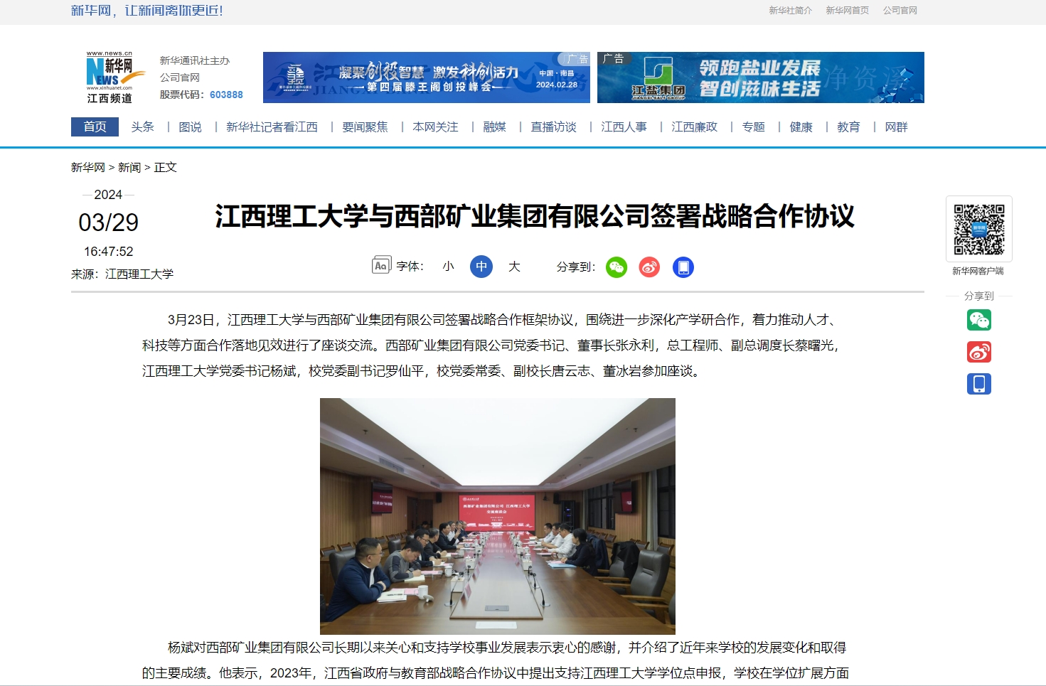 与西部矿业集团有限公司签署战略合作框架协议,围绕进一步深化产学研合作,着力推动人才、科技等方面合作落地见效进行了座谈交流。西部矿业集团有限公司党委书记、董事长张永利,总工程师、副总调度长蔡曙光,抖阴