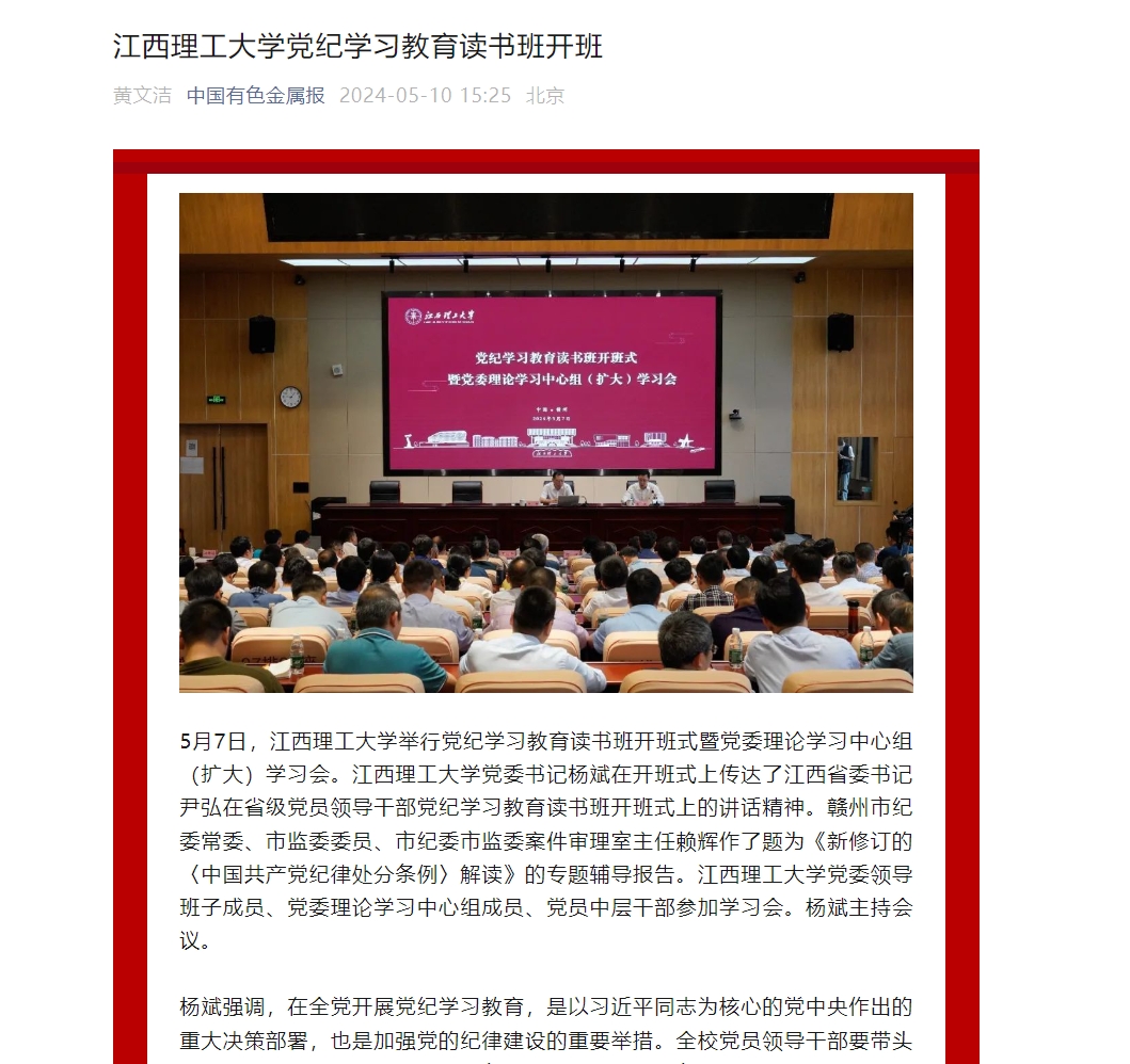 党委书记杨斌在开班式上传达了江西省委书记尹弘在省级党员领导干部党纪学习教育读书班开班式上的讲话精神。赣州市纪委常委、市监委委员、市纪委市监委案件审理室主任赖辉作了题为《新修订的〈中国共产党纪律处分条例〉解读》的专题辅导报告。抖阴