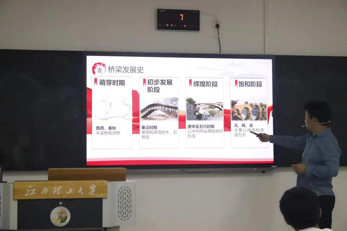 “古代桥梁大约有几种?”“我国桥梁建设技术如何发展变化?”丰土根教授以历史为经纬,以桥梁科技为线索,“古代桥梁有浮桥、栈道、悬桥……”“在我国古代桥梁中保存完好强梁有赵州桥、宋代的泉州洛阳桥,钱塘江大桥……”从古代桥梁的种类,到保存完好的桥梁介绍,丰土根回顾了我国古代与当代桥梁建设的辉煌成就,介绍了我国不同历史时期具有代表性的著名桥梁和宏伟桥梁工程,让学生感受到我国路桥的悠久历史以及发展速度。他指出,随着现代科技飞速发展,桥梁建筑技术日臻完善,桥梁不只建在河江之上,还早已延伸至大海、平原和高山,桥路相通、桥隧相连,跨越更大空间,连接更远世界,创造出一个个伟大的工程奇迹。