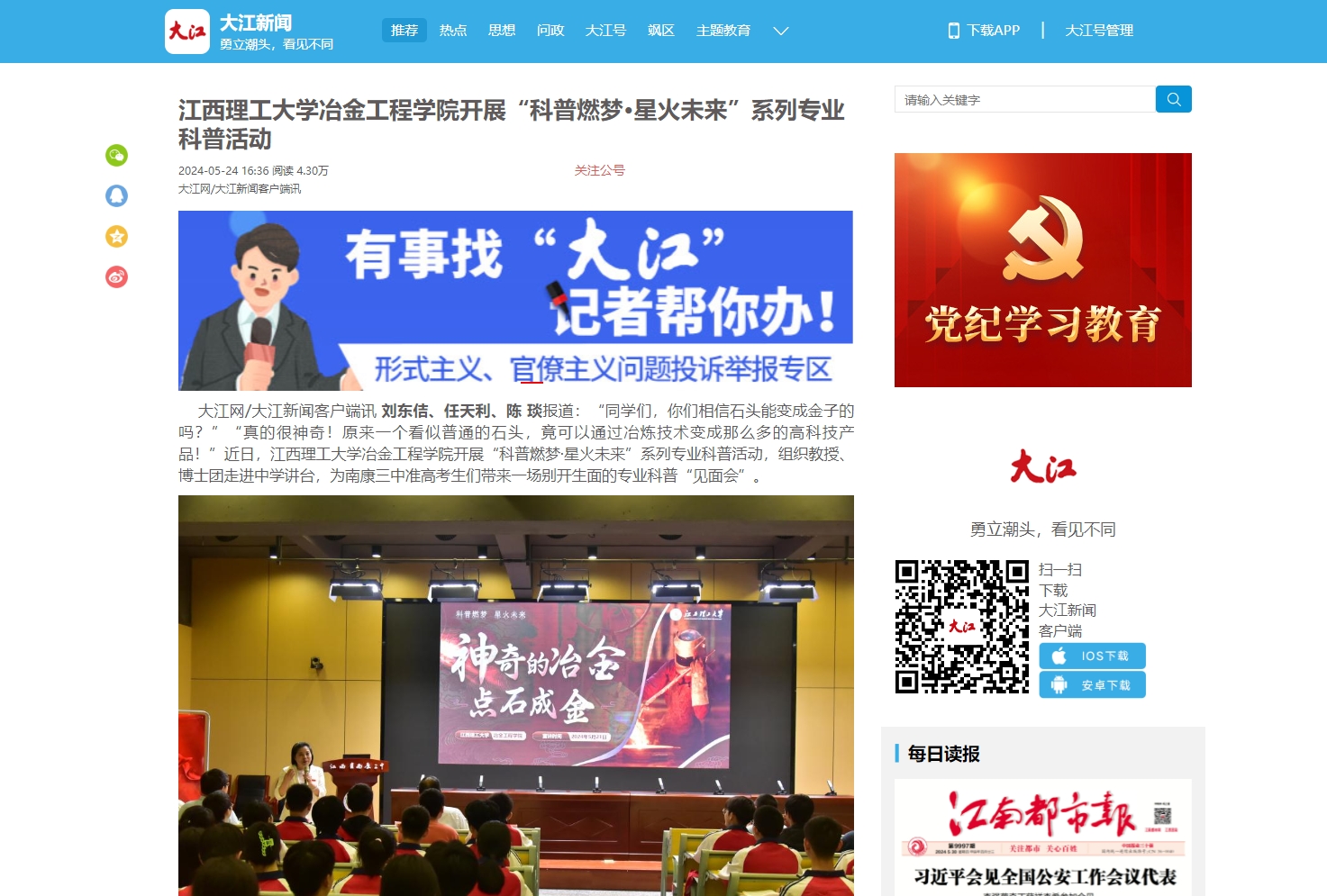 大江网/大江新闻客户端讯刘东佶、任天利、陈 琰报道:“同学们,你们相信石头能变成金子的吗?”“真的很神奇!原来一个看似普通的石头,竟可以通过冶炼技术变成那么多的高科技产品!”近日,抖阴