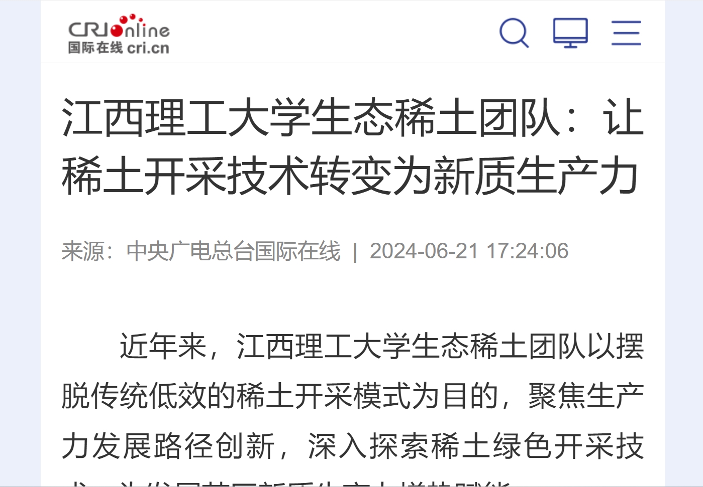 推动科技成果从科研院所走向企业、从实验室跃上生产线,是发展新质生产力的必由之路。目前,离子型稀土母液连续共沉淀-选择性除杂技术已在国内稀土矿山进行落地应用,该技术的实施,可将稀土综合回收率提升5%以上,同时回收了铝资源,显著改善矿区的水体环境,经济生态效益显著,在收获金山银山的同时,也守护了绿水青山。