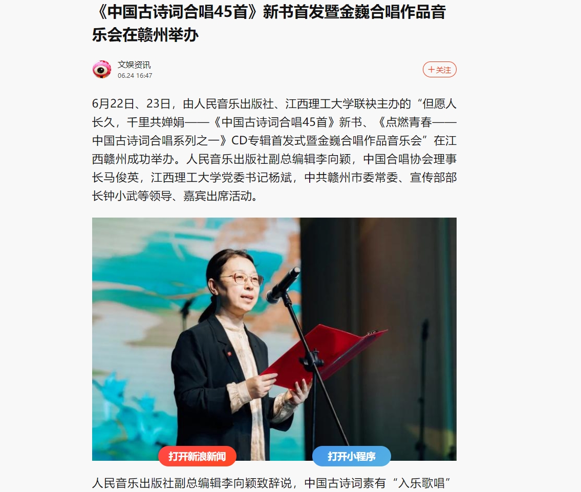 联袂主办的“但愿人长久,千里共婵娟——《中国古诗词合唱45首》新书、《点燃青春——中国古诗词合唱系列之一》CD专辑首发式暨金巍合唱作品音乐会”在江西赣州成功举办。人民音乐出版社副总编辑李向颖,中国合唱协会理事长马俊英,抖阴