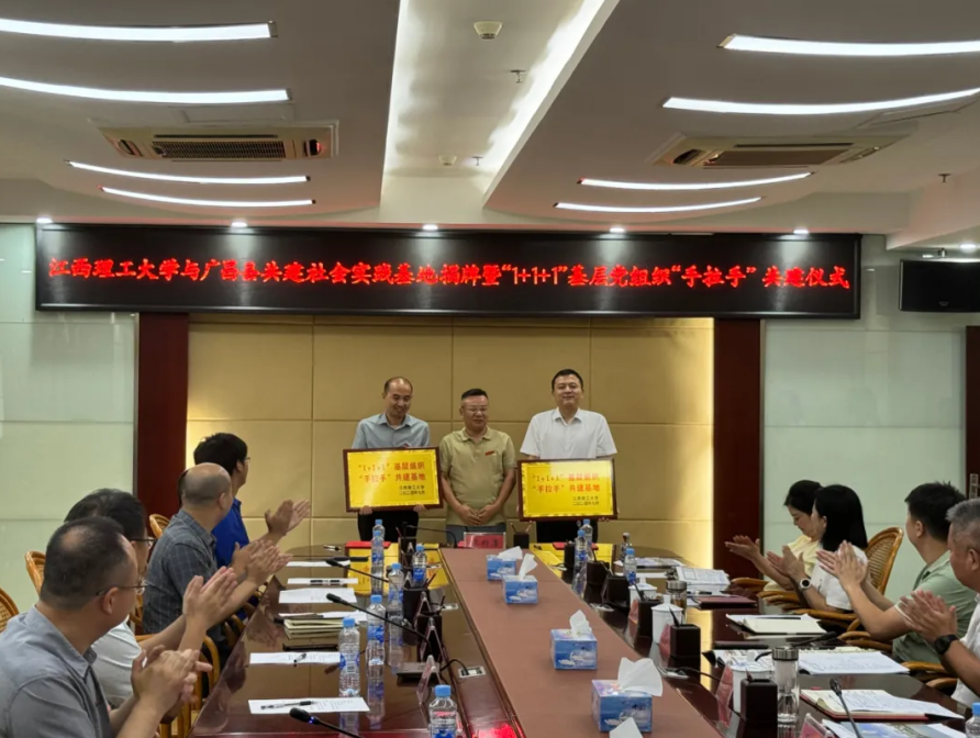 能源与机械工程学院第三党支部、广昌县旴江镇机关党支部、江西省广德环保科技股份有限公司党支部授牌,三方共建支部代表作了发言并进行了签约。
