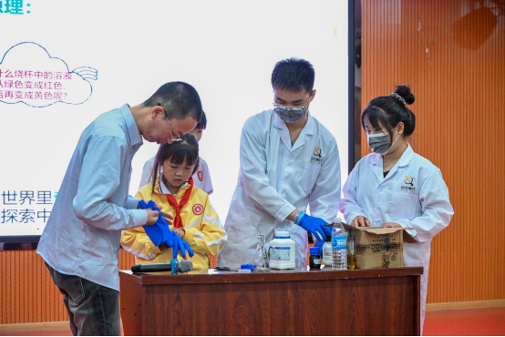 廖金生教授的讲座中,孩子们通过化学科普了解到绚丽变幻莫测的灯光秀背后的神奇奥秘。在随后的科普实验环节,抖阴