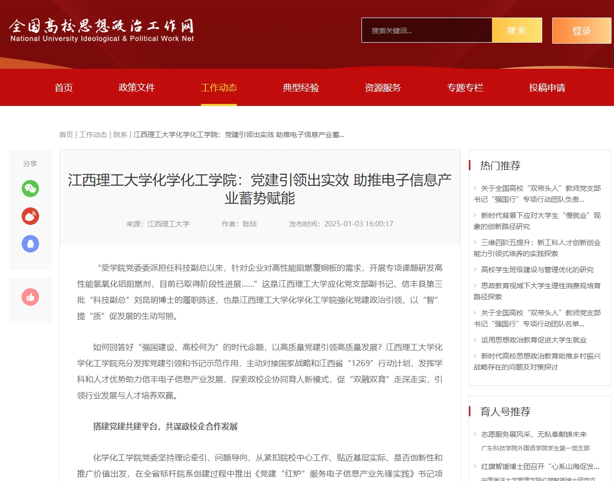 化学化工学院充分发挥党建引领和书记示范作用,主动对接国家战略和江西省“1269”行动计划,发挥学科和人才优势助力信丰电子信息产业发展,探索政校企协同育人新模式,促“双融双育”走深走实,引领行业发展与人才培养双赢。