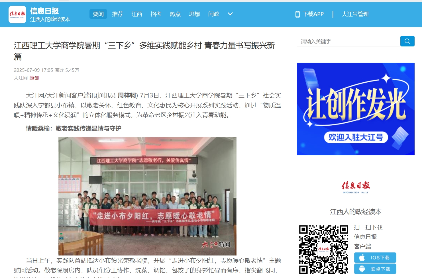 商学院暑期“三下乡”社会实践队深入宁都县小布镇,以敬老关怀、红色教育、文化惠民为核心开展系列实践活动,通过“物质温暖+精神传承+文化浸润”的立体化服务模式,为革命老区乡村振兴注入青春动能。