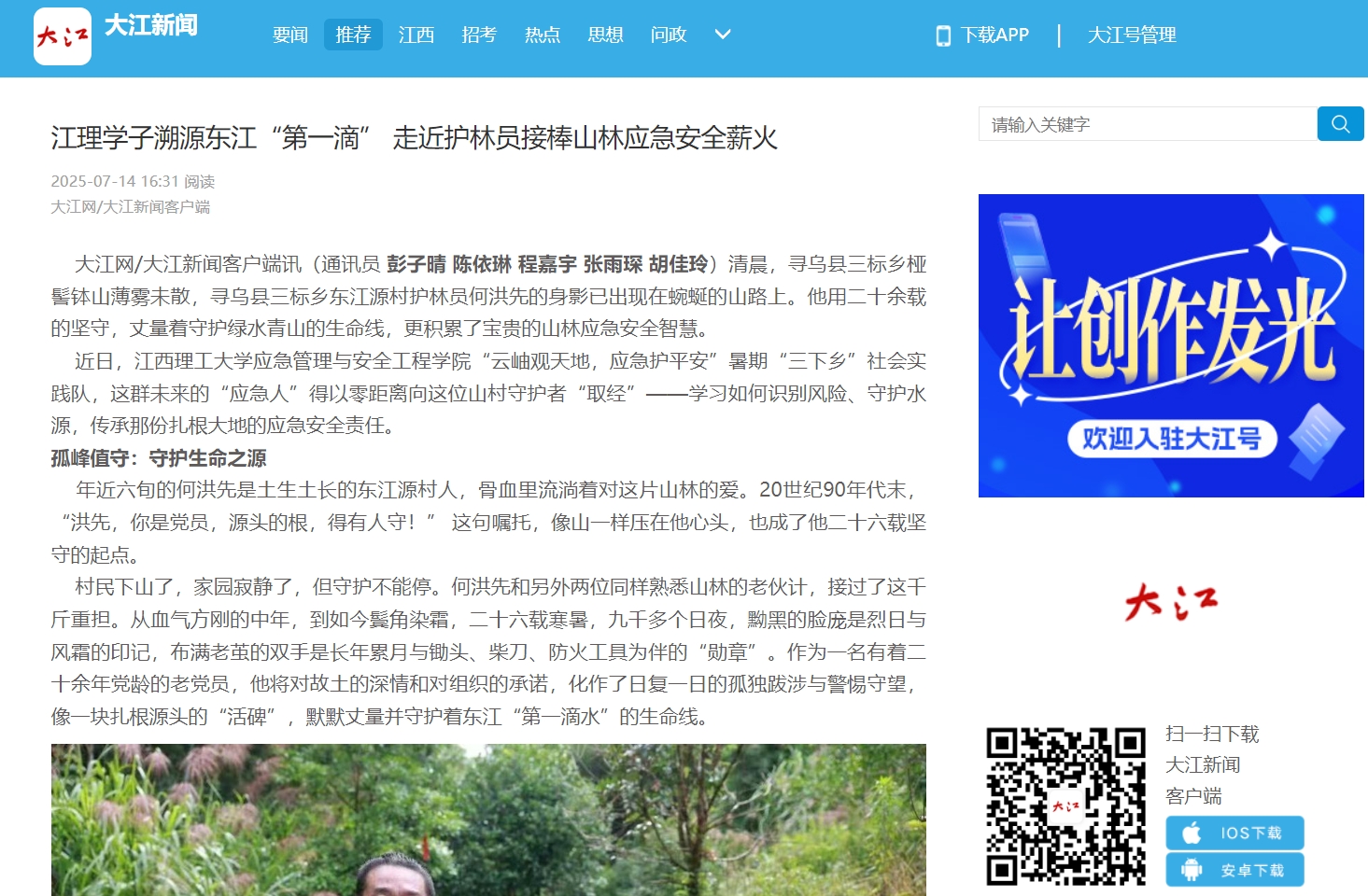 大江网/大江新闻客户端讯(通讯员彭子晴 陈依琳 程嘉宇 张雨琛 胡佳玲)清晨,寻乌县三标乡桠髻钵山薄雾未散,寻乌县三标乡东江源村护林员何洪先的身影已出现在蜿蜒的山路上。他用二十余载的坚守,丈量着守护绿水青山的生命线,更积累了宝贵的山林应急安全智慧。