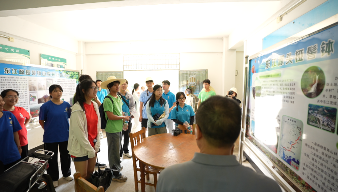 ▲何洪先在向实践队员介绍东江源 摄影|张雨琛