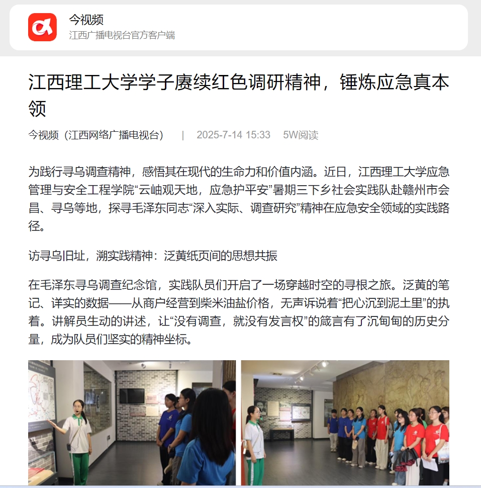 “从寻乌调查的‘问计于民’,到应急管理的‘踏勘于险’,红色调研精神的内核从未改变——就是用最扎实的‘脚力’和‘眼力’,去发现最真实的风险,从而做出最有效的应对。”此次实践以“寻根”为脉络,成功将红色基因融入现代应急“观天”“管地”的经纬,有力锤炼了学子们守护平安的真本领。(彭子晴、程嘉宇 )