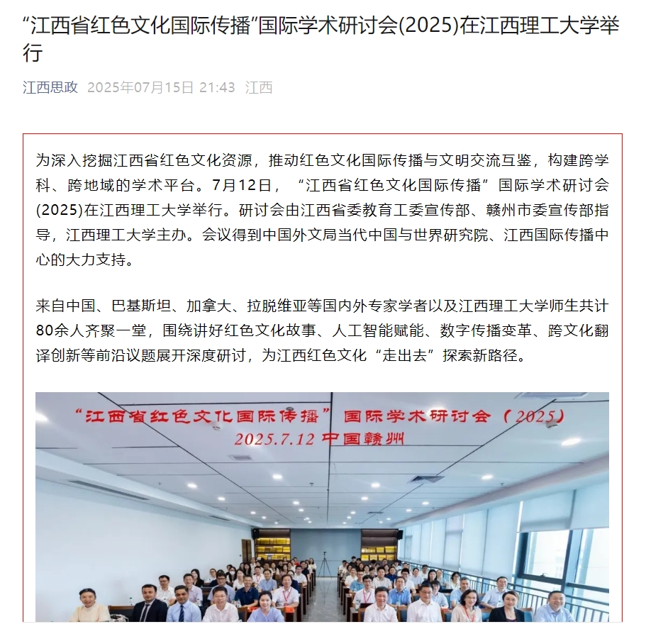 为深入挖掘江西省红色文化资源,推动红色文化国际传播与文明交流互鉴,构建跨学科、跨地域的学术平台。7月12日,“江西省红色文化国际传播”国际学术研讨会(2025)在抖阴