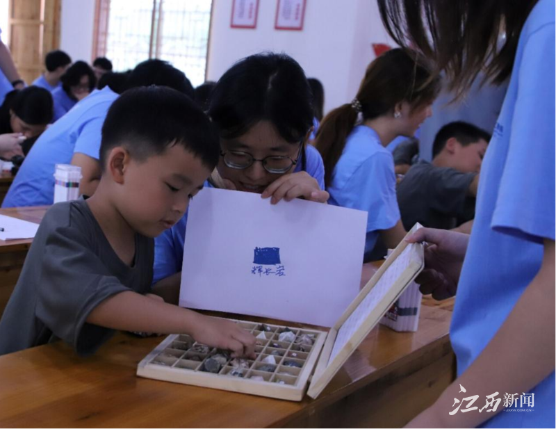 ▲实践队员们向小朋友讲述矿石知识