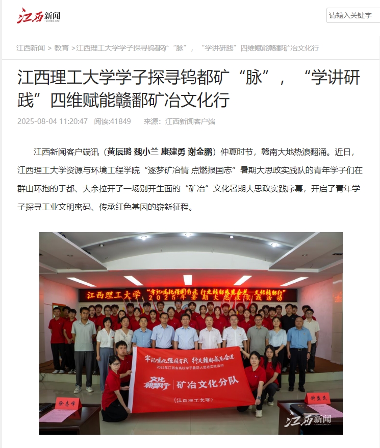 从血色钨砂道到绿色矿山,从传统开采到智能转型,江西理工学子以“学讲研践”立体化实践模式,在矿冶文脉中解码发展智慧。这支青春队伍正将调研成果转化为发展良策,以实际行动响应“强国建设有我”的时代召唤,为谱写中国式现代化江西篇章注入蓬勃青春动能!